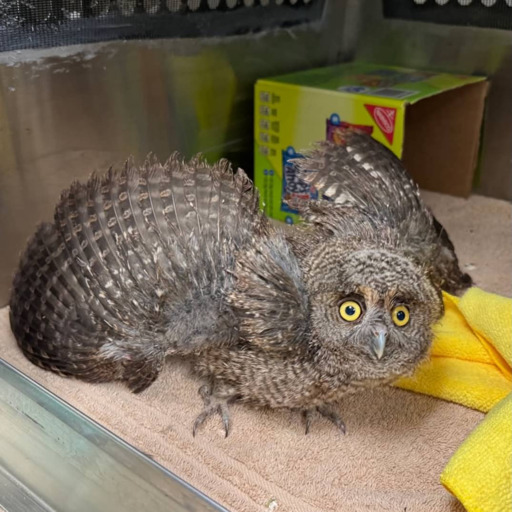 Our center received a fledgling Western Screech Owl on March 14th. The baby was found on the ground with its eyes closed in Sacramento. It did not move when approached with a catch towel, and only opened its two eyes. The fledgling was taken to the UC Davis Veterinary Hospital, and then transferred to the California Raptor Center. An examination was done where a small abrasion on the head was found and there was soiling on feathers of the head and back. On the 15th, a CRC volunteer went to the fledgling’s rescue location to search for a nest or parents, but neither was found.